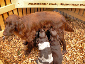 In den ersten Lebenswochen konnte man über die endgültige Haarentwicklung der Welpen noch gar keine Aussagen machen. Alle 9 Welpen waren einheitlich in der Haarausprägung und in der Haarfarbe, sie waren braun. Erst in der 4. bis 5. Lebenswoche bildeten sich nach und nach Unterschiede heraus. Der Wurf hatte sich zu diesem Zeitpunkt gut entwickelt. Der Wurf brachte 3 langhaarige braune Welpen: